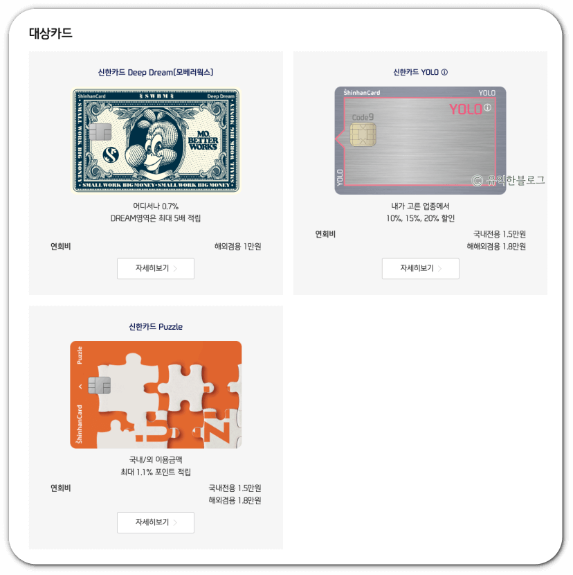 이번 우체국 신한우정적금 이벤트의 대상 카드에는 3종류가 있는데요, 신한카드 Deep Dream(모베러웍스), 신한카드 YOLO, 신한카드 Puzzle의 3가지 카드입니다.