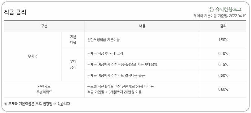- 우체국 우대금리 : 우체국 적금 첫 거래 고객 0.1% + 우체국 예금에서 신한우정적금으로 자동이체 납입 시 0.15% + 우체국 예금에서 신한카드 결제대금 출금 시 0.2%