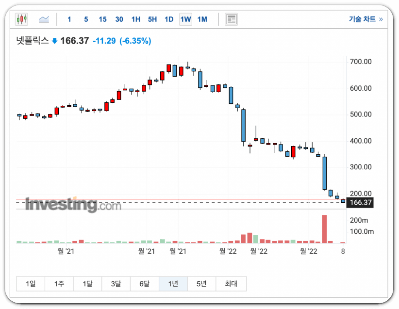 올해 넷플릭스 주가는 하루에 35% 급락하는 등 하락세를 보이고 있습니다. 올 1월에 고점을 찍어 609달러까지도 갔었는데요, 현재 이 글을 쓰는 시점 넷플릭스 주가를 조회해 보니 166.37달러까지 떨어져 있네요.