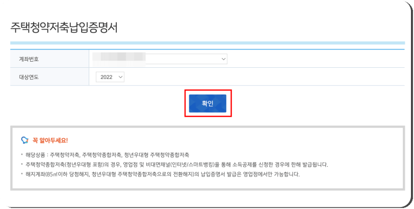 계좌번호와 대상연도를 선택한 뒤 ‘확인’을 누르면 간단하게 발급이 가능해요.