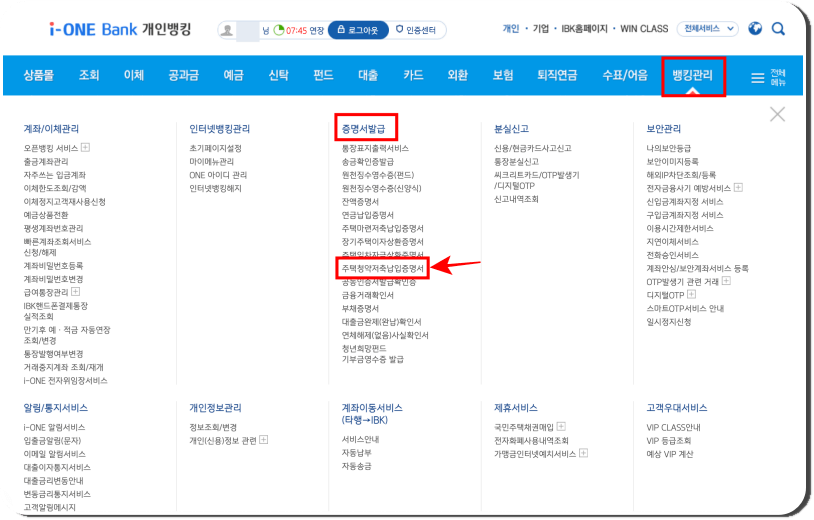 뱅킹관리 > 증명서발급 > 주택청약저축납입증명서 메뉴를 선택하면 됩니다.