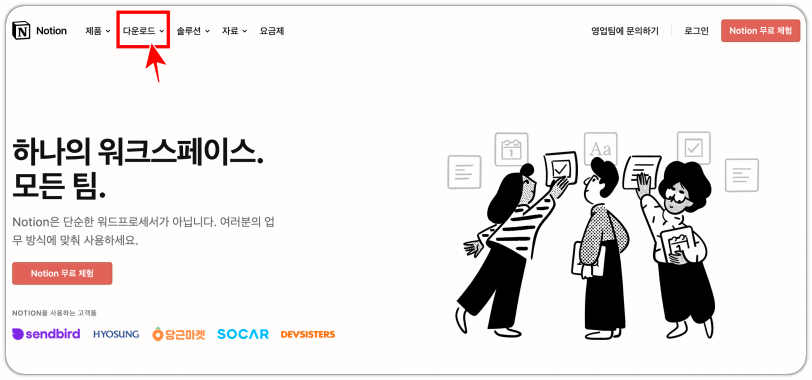 노션 공식 사이트 접속 후 ‘다운로드’ 메뉴에서 다운받으시면 됩니다.