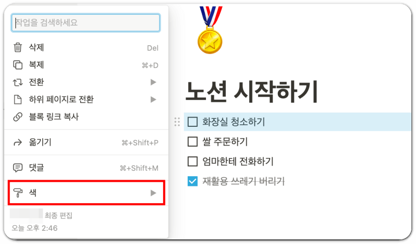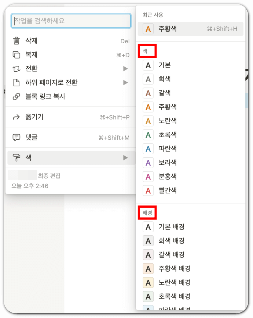 블록에 마우스를 가져가면 나오는 왼편의 점 6개를 클릭하면 메뉴가 쭉 뜨는데요, 메뉴들 중 ‘색’에서 글자색과 배경색을 변경할 수 있습니다.