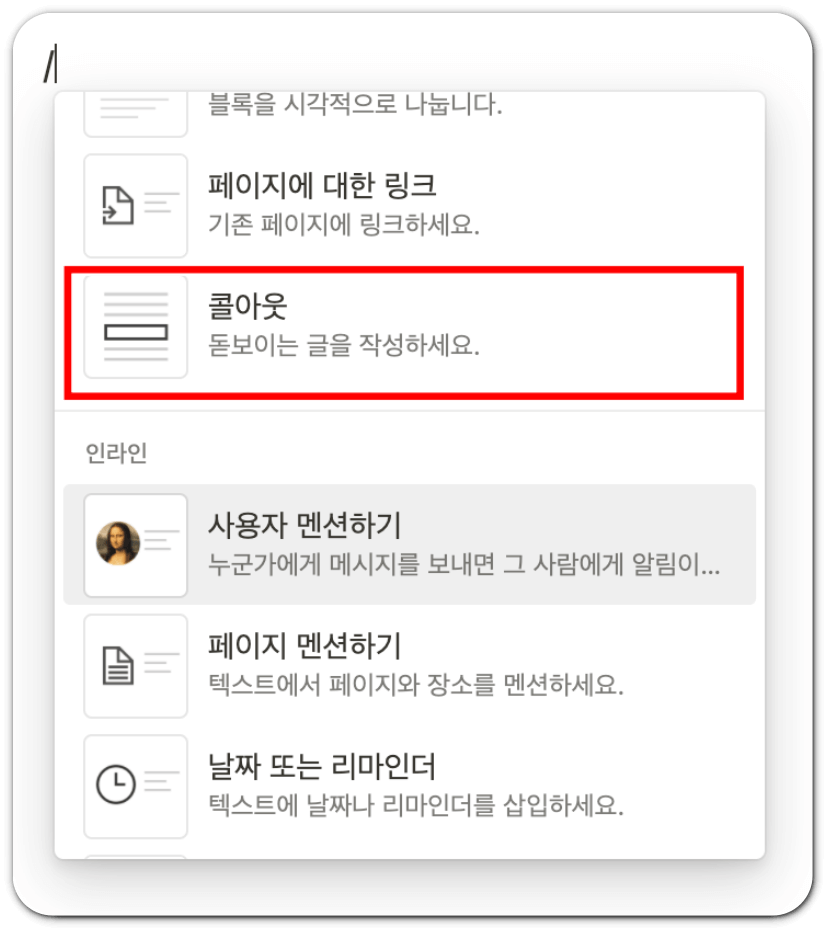 아무곳에나 클릭을 한 뒤 슬래쉬(/) 를 입력한 뒤 나오는 메뉴에서 ‘콜아웃’ 을 선택합니다. (또는 ‘/콜아웃’ 입력)