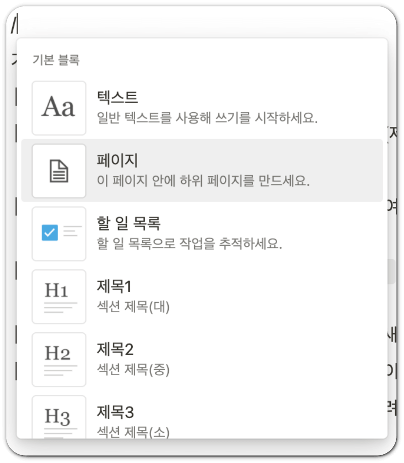 노션의 블록에는 다양한 기능을 추가할 수 있습니다. 아무곳이나 클릭을 한 뒤, 키보드의 슬래시 키를 누르면 다양한 속성값들이 뜨는 것을 볼 수 있어요.