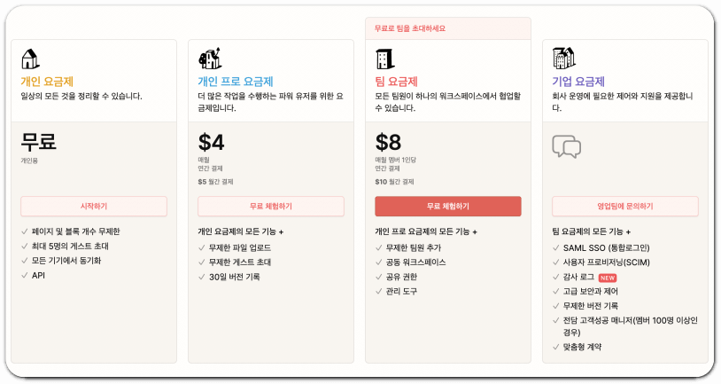 본격적으로 노션을 사용하기에 앞서 먼저 회원가입을 해야 하는데요, 노션에서는 총 4종류의 요금제를 제공합니다.