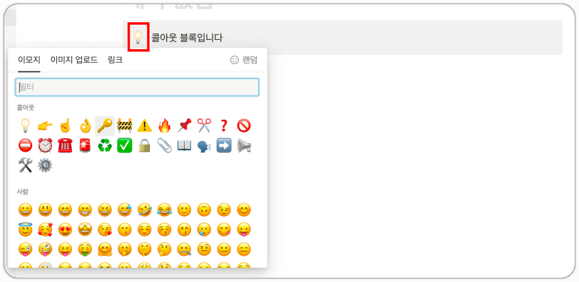그럼 콜아웃 블록이 만들어지는데요, 콜아웃 블록은 배경색+이모지를 이용해 내용을 강조하고자 할 때 사용하면 좋은 블록입니다.