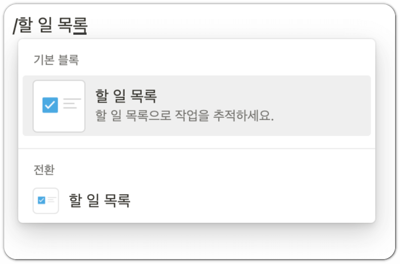 아무곳이나 클릭을 한 뒤 슬래시(/) 키를 누르면 나오는 속성 중 ‘할 일 목록’을 선택합니다.