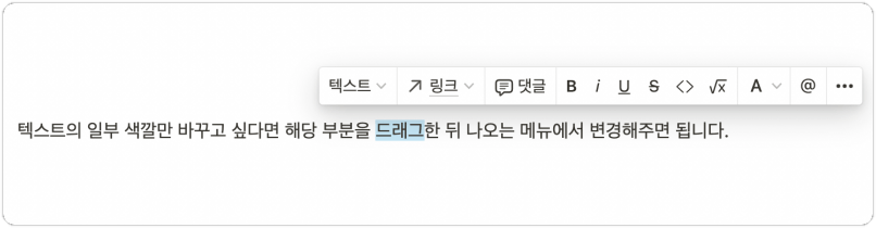 블록에 있는 텍스트 중 일부의 색깔만 바꾸고 싶다면, 해당 부분을 드래그한 뒤 나오는 메뉴에서 ‘A’라고 되어있는 부분을 눌러 글자색 혹은 배경색을 변경해주면 됩니다.