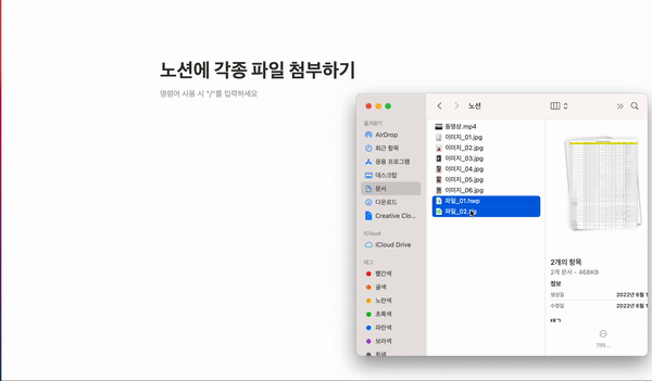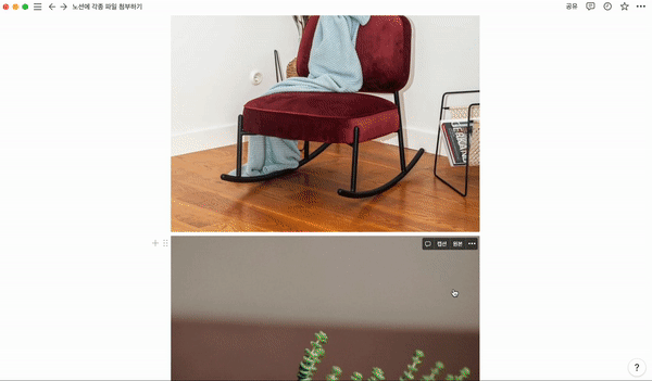 노션에 이미지 넣는 법은 설명할 것도 없이 정말 간단한데요, 탐색기나 파인더에서 이미지 파일을 쭉 끌어다 놓기만 하면 됩니다.