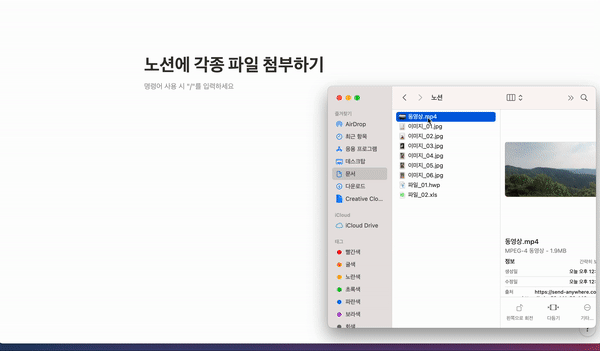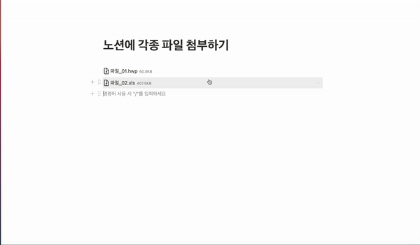 pdf나 엑셀, 한글 파일, zip 파일 등 각종 파일들도 손쉽게 업로드할 수 있습니다. 이미지를 넣을 때와 마찬가지로 탐색기나 파인더에서 파일을 끌어와 툭 놓기만 하면 됩니다.