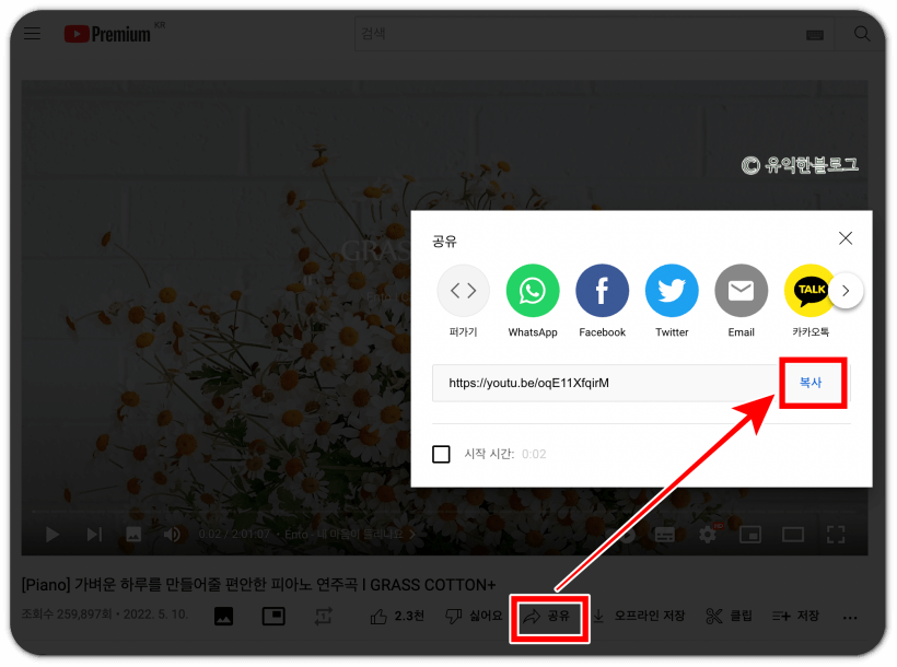 노션에 유튜브 동영상을 임베드하는 것도 가능합니다. 먼저 임베드할 유튜브 영상에서 ‘공유’를 누른 뒤 주소를 복사해주세요.