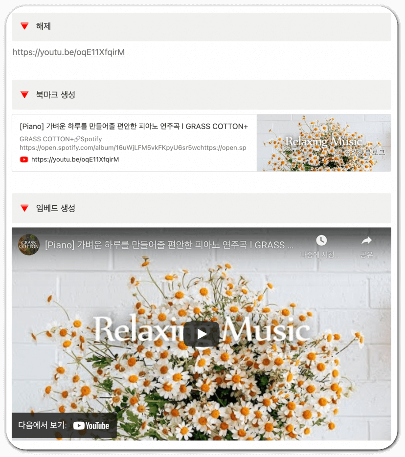 ‘해제’를 누르면 그냥 주소만 표시됩니다. 그리고 ‘북마크 생성’을 누르면 썸네일, 제목, 내용 등이 담긴 북마크 박스가 생기게 되죠.