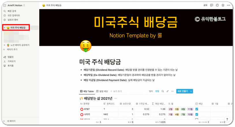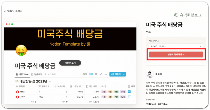 미국 주식 종목과 종목별 배당 여부, 배당금, 배당 지급 월 등을 관리할 수 있는 템플릿이라고 하네요. 노션에 로그인되어 있는 상태에서 ‘템플릿 복제하기’를 부르면 바로 내 워크스페이스에 복제가 됩니다.