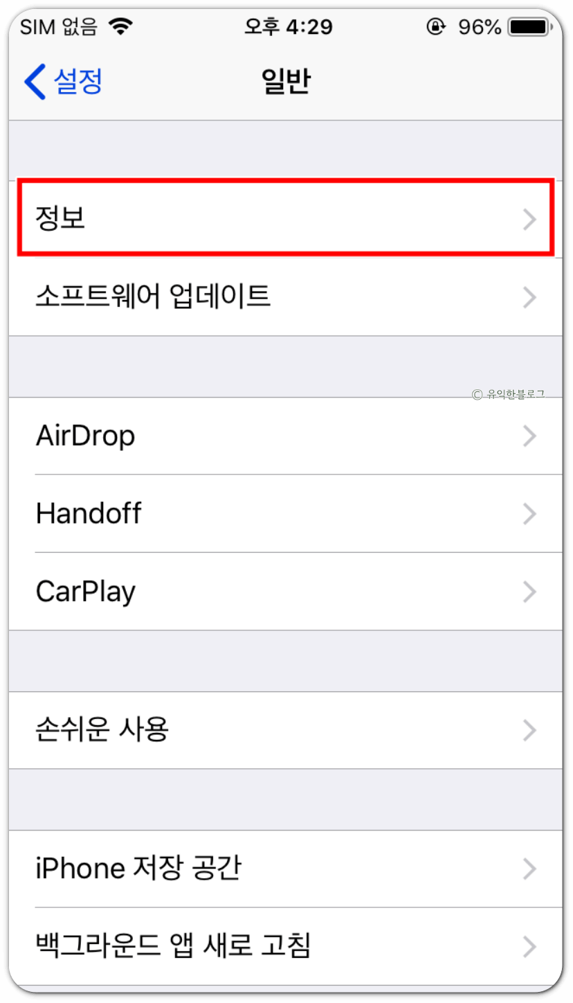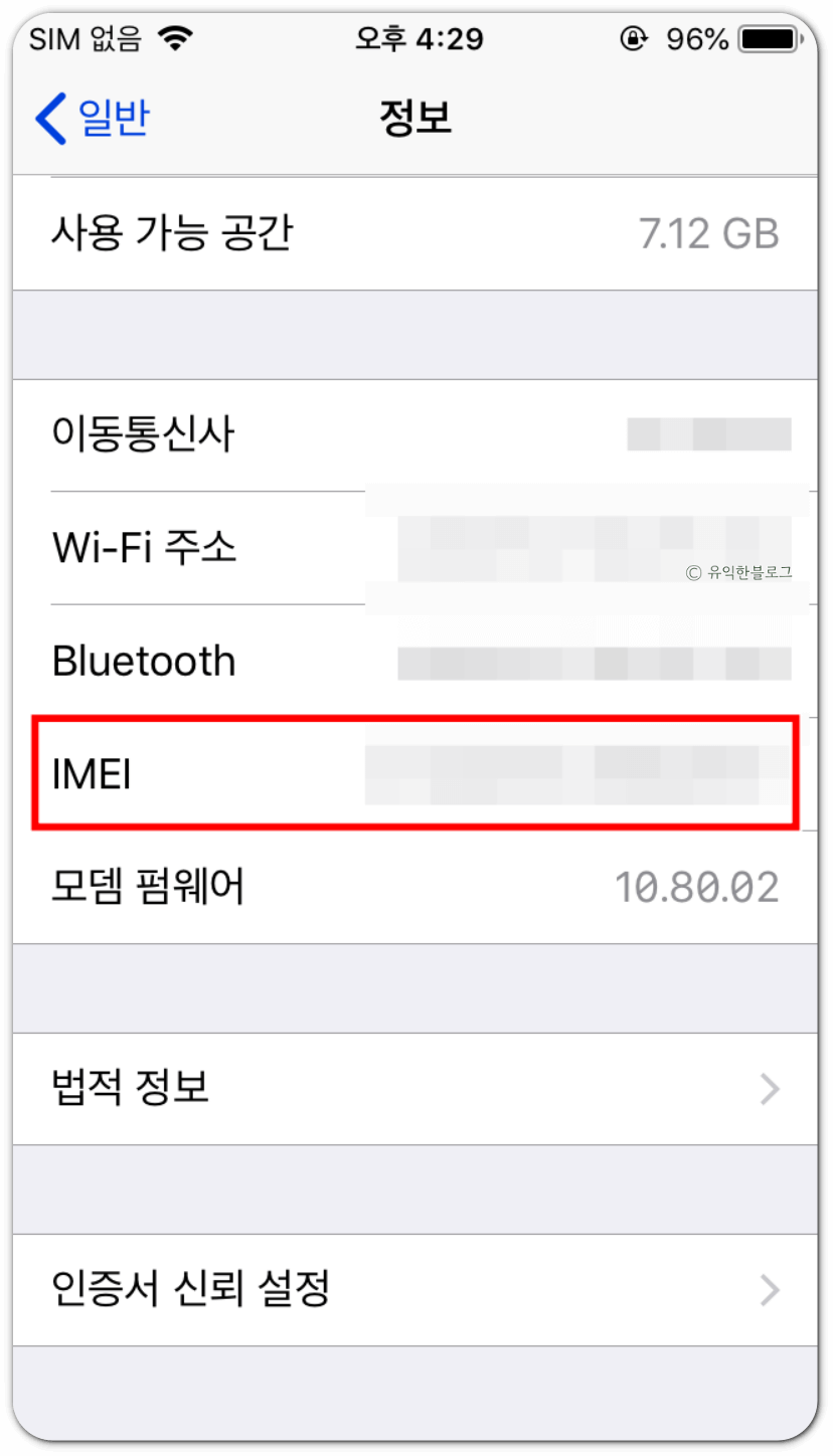 여기서 ‘정보’ 를 터치하시면 IMEI값을 확인하실 수 있습니다.
