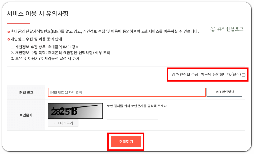 개인정보 수집 및 이용 동의에 체크를 한 뒤 IMEI번호를 입력하고, 보안문자를 입력한 뒤 ‘조회하기’ 버튼을 눌러주기만 하면 됩니다.