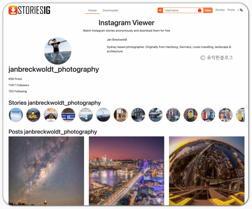 제가 팔로우중인 한 포토그래퍼님의 인스타 아이디를 입력해보았는데요, 아래 화면과 같이 입력한 아이디의 인스타그램 피드를 볼 수 있습니다. 인스타 스토리 뿐 아니라 사진 형식의 포스트들까지 전부 볼 수 있어요. 참고로 24시간 이내에 업로드된 스토리가 없을 경우 스토리는 뜨지 않습니다.